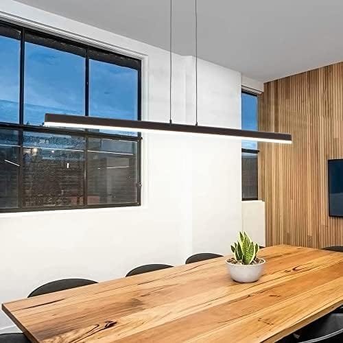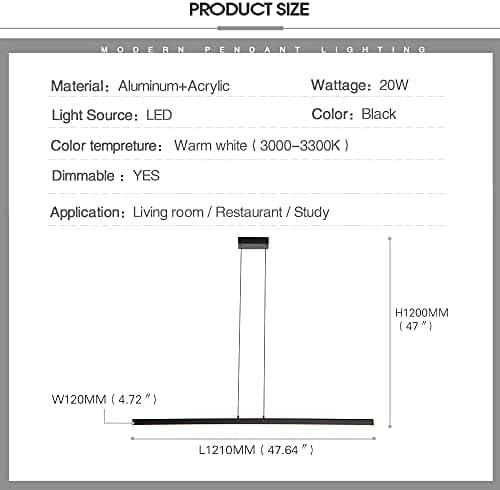 [PARAMETERS] The dimmable linear black pendant light details, Color: sandy black. LED Light source, Warm white:3000K; Dimensions:47.64″(L)*4.72″(W)*47″(H); Weight: 2.65 LB; Voltage:110 Volts.Wattage:20W. Canopy Size: 6.3″ x4.7″x1.38″(LxWxH).