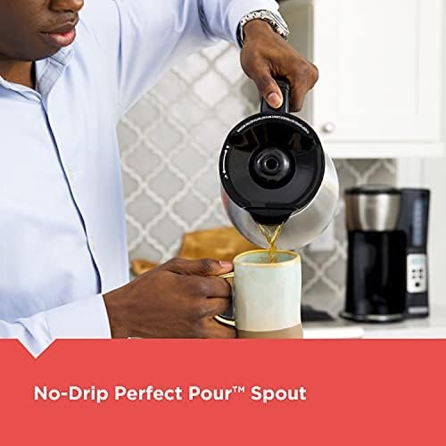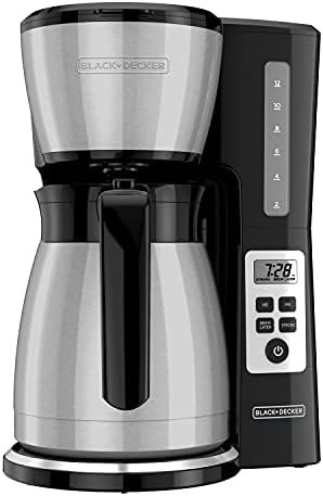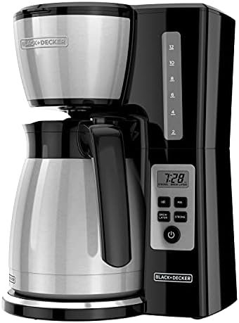 Keep coffee hot for up to two hours** with the BLACK+DECKER™ 12-Cup* Thermal Programmable Coffeemaker. The thermal carafe features a four layer vacuum seal to maintain optimal temperature for up to 2 hours**. The vacuum seal locks in heat while staying cool to the touch. The Vortex™ Technology evenly saturates coffee grounds for full and rich flavor extraction using optimal water temperatures. Plus, you can customize the brew to fit your tastes. The easy-to-use digital controls include a delay timer and the option for a stronger brew. As an added feature, the LCD display includes a fresh brew timer that indicates how much time has passed since the coffee was brewed, up to 120 minutes. *cup equals approximately 5 oz. (varies by brewing technique) **Keeps coffee 154°F or hotter up to two hours