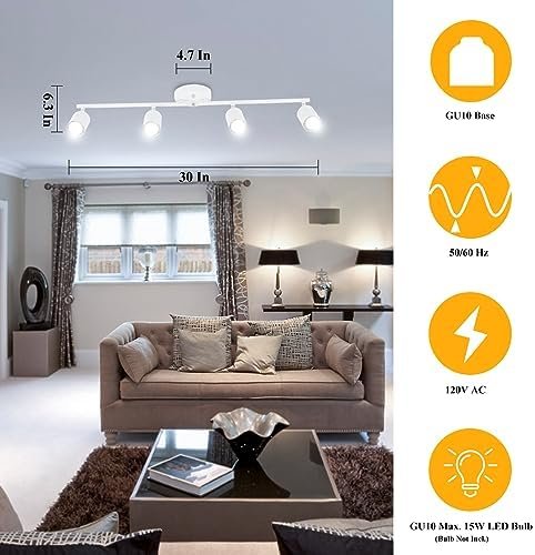 Wide Application: The 4 way ceiling track light for easy customizing your lighting needs, Overall size: 30” L x 6.3” W x 4.7” H, canopy size: 4.7” D x 0.98” H. You can adjust the light heads to different angles. The 4 track heads can be rotate 350° horizontally and 90° vertically. This light perfect addition to hallway, entry, porch, mudroom, stairwell, kitchen, closet, kids room, dining room, bedroom, living room, bathroom, bar, cafe, hotel and restaurant.