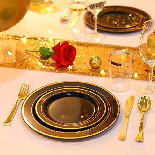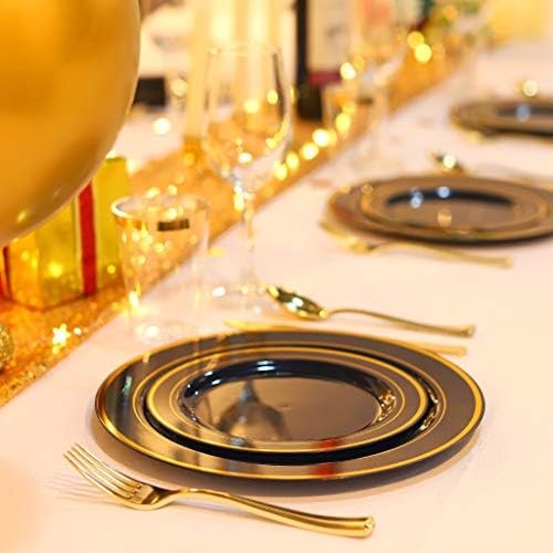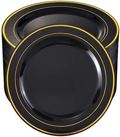 ELEGANT:Exceed your guests’ expectations !Black plastic plates with gold rim have a beautiful appearance and the metallic trim adds to the elegance.The high gloss finish and the elegant gold rim give them a look which is similar to china.