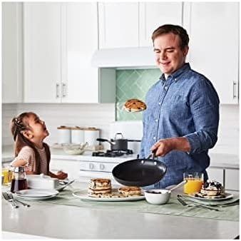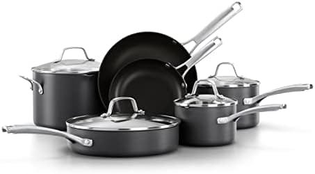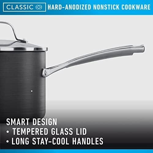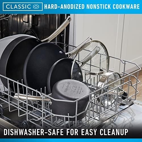 Designed to save you time in the kitchen, Calphalon Classic Hard-Anodized Nonstick Cookware delivers cooking versatility every step of the way with an improved* easy-release surface. Featuring AquaShield nonstick technology, this cookware line performs like new 40% longer* for remarkable food release over and over again. Made with water-based nonstick and a hard-anodized exterior, it’s dishwasher-safe for quick cleanup. Convenient measuring marks, straining covers, and pour spouts allow you to cook efficiently. Long stainless steel handles make lifting and moving easy and stay cool on the stovetop. This nonstick cookware set is oven-safe up to 450 degrees F, so it can go from the stovetop into the oven for heating. Elevate your cooking experience with Calphalon Classic, and enjoy exceptional performance with endless possibilities. (*vs. previous generation of Calphalon Classic)
