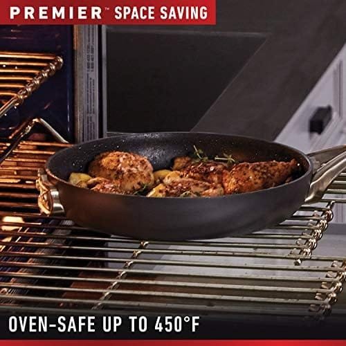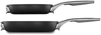Calphalon Premier space saving hard anodized nonstick cookware securely stacks to save 30% more space. Unique vessel and handle designs allow the cookware to stack and nest in any order. The durable, hard anodized construction allows for even heating with no hot spots and is dishwasher safe for easy cleanup. The 3-layer nonstick interior is durable enough to withstand metal spatulas, spoons and whisks. The Calphalon Premier space saving fry pan combo contains one 8″ diameter and one 10″ diameter fry pan. Look for other 8″ and 10″ diameter products to complete your stacks. Average space saved vs. Like non-stacking Calphalon cookware items cookware must have same diameter