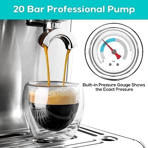 ☕【Professional 20-Bar Pressure System】: Semi-Automatic, all-in-one espresso machine with 20-bar professional Italian pump and 1500W powerful motor. This latte machine gives you top quality extraction, resulting in a more fragrant and rich aroma. The built-in pressure gauge on this cappuccino machine shows the exact pressure helping you make adjustments according to your personal taste preferences. You can create an cappuccino, latte or flat white in your home or office with our cappuccino maker.