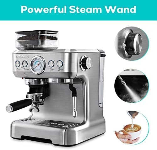 ☕【Stylish & User-Friendly Design】: With a simple & clear dial interface for selecting steam, hot water and pre-programmed single & double shots, this 20 bar espresso coffee machine with grinder is very easy to use. The 92 oz transparent water tank is detachable and easy to fill. The beautiful brushed stainless steel design makes this latte maker suitable for any size kitchen. We also provide one year warranty, and if we can be of assistance in any way, please don’t hesitate contact us.