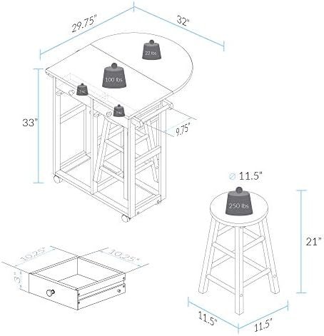 Dimensions: Table: 33 inches high x 29.75 inches wide x 32 inches deep; Stool: 21 inches high x 11.50 inches wide x 11.50 inches deep; Weight 39.85 pounds