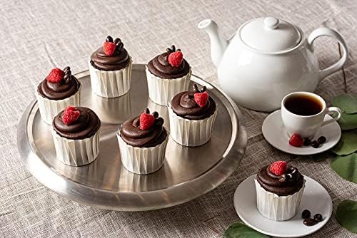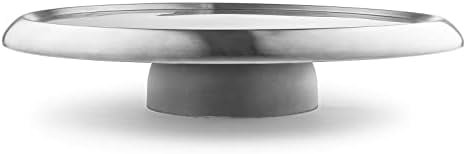 The surface of the cake tray is flat and smooth, designed for easy slicing and serving cakes. It is also a stylish way to display cupcakes, macarons, candies, cookies, fruit, or other desserts. This unique versatile tray goes great with modern, chic or elegant room décor. It is made of premium stainless steel.