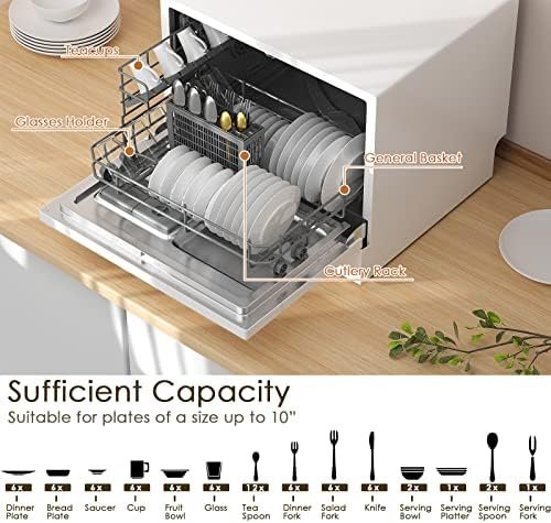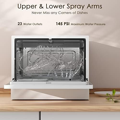 【360° Top & Lower Spray Arms】In the interior of countertop dishwasher, the top and lower spray arms can rotate 360 degrees for a powerful cleaning. When they operate, 23 water outlets on the arms will spray strong water flows to effectively rinse the stains, never missing any corners of dishes, convenience for cleaning pots and pans and single serve dishes.
