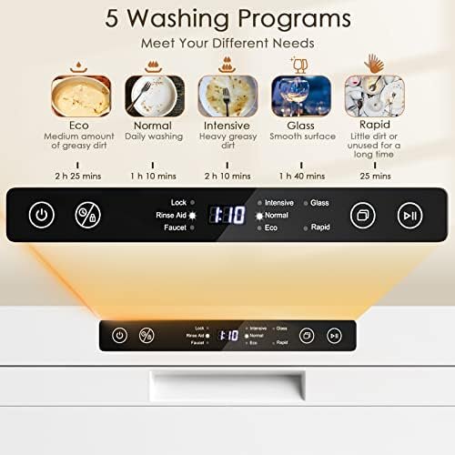 【5 Washing Programs & Child Lock】This portable dishwasher is preset 5 washing programs, including ECO, Normal, Intensive, Glass and Rapid. You can choose different washing modes according to different washing needs. Also, by pressing the Child lock button for 3 seconds, you can turn on the child lock function to prevent children from accidentally touching the control panel.