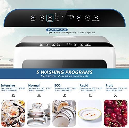 💦DRY MODE & DELAY FUNCTION——With PTC hot air drying mode, the portable dishwasher will keep the dishes clean and dry. It works 90 mins each alternate 12 hrs and turned off after 163.5 hrs. Moreover, the delay function (1-12 hours optional) of the dishwasher operates with a washing mode, allowing you to set appointed time to wash.