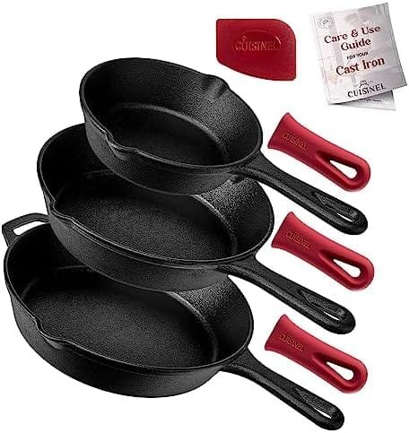 Cuisinel Cast Iron Skillets Set – 3-Piece: 6″ + 8″ + 10″-Inch Chef Frying Pans – Pre-Seasoned Cookware + 3 Heat-Resistant Handle Cover Grips – Indoor/Outdoor Use – Grill, Stove, BBQ, Fire, Oven Safe