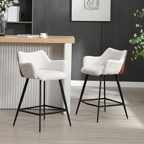 DM Furniture 26″ Bar Stools for Kitchen Island Set of 2 Linen Counter Stools with Arms Mid Century Modern Counter Height Barstools w/Faux Leather Decor/Metal Legs for Home Pub/Breakfast Bar, Beige