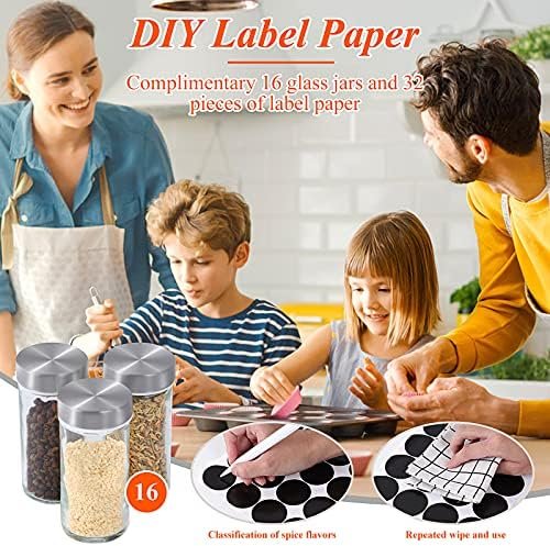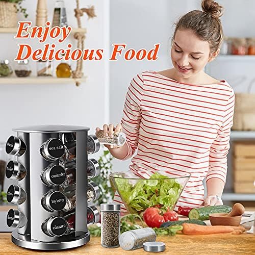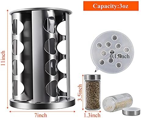 【Safe & Durable Material】Our rotating revolving spice rack is made of high quality stainless steel, strong and durable. The glass jar is made of lead-free glass, which is safe and secure to store the spices, and the transparent jar body is convenient for observing the spices.