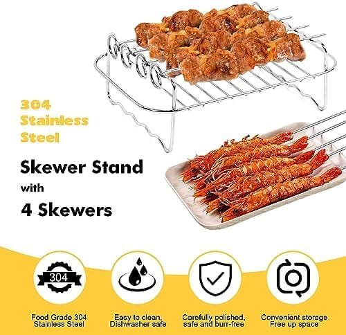 PRACTICAL DESIGN, EASY TO USE – The multi-purpose air fryer rack allows for good air circulation and doubles up the products being cooked, no waste of space of the air fryer. And the skewer rack with 4 skewers which enables you to make kebabs and all sorts of other foodstuffs served on skewers. The greater has additional kitchen tongs, oil brush and 100Pcs paper liners as well as which make preparation, serving & cleaning a breeze.