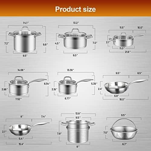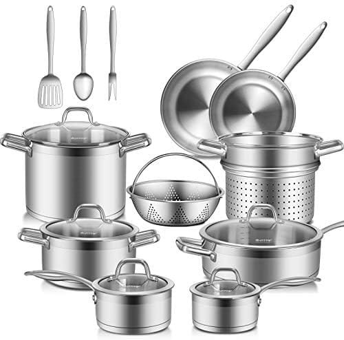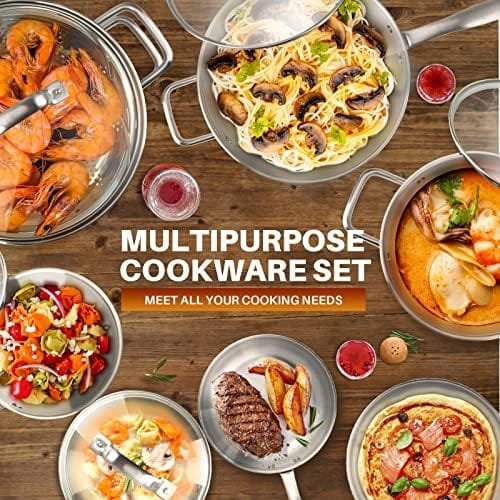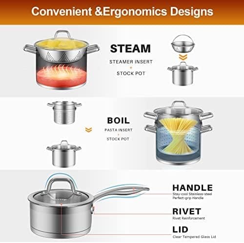FAST & EVEN HEATING: Heavy gauge impacted-bonded aluminum encapsulated bottom of the kitchen cookware set provides a quick, even and energy-efficient heating. Suitable for all stovetops, such as induction, gas, electric and halogen cooktops—perfect for even the most seasoned cooks.
