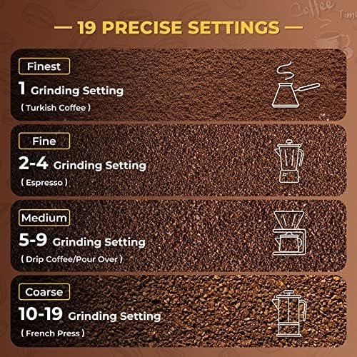 19 Precise Settings: The burr coffee grinder provides 19 settings, can brew a variety of coffee. Suitable for turkish, espresso, french press, drip coffee or pour-over to meet your different needs for coffee. And our grinder coffee can also be applied to portafilter of various sizes.