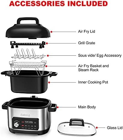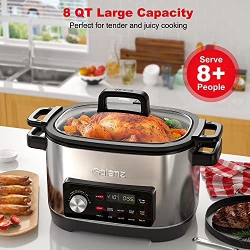 MULTIPLE COOKING OPTIONS – Galanz 8-in-1 multi-cooker offers a variety of cooking options including slow cook, air fry, grill, sous-vide and more. Air fry cooking with our slow cooker makes it easy to enjoy crispy fried meals with little or no oil. The slow cook function and sous vide maintain precise time and temperature control for delicious, delicious meals.