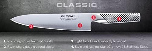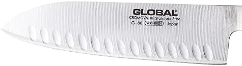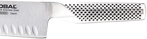 The Global 7″ Hollow Ground Santoku Knife is a great alternative to the chef’s knife. Great for cutting, chopping and mincing vegetables. The scalloped blade has a straighter edge than a chef’s knife and has a blunted sheepsfoot-tip blade with a thinner spine. It can easily slice thin-boned and boneless meats, fish and vegetables.
