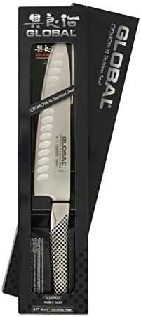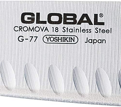 This stainless steel kitchen knife has an elegant design with a modern and distinctive look. The knife is constructed using methods similar to the Samurai swords of old, with a razor sharp, thin blade which is extremely durable; each knife is carefully weighted to ensure perfect balance in the hand. The smooth contours and seamless construction eliminate food and dirt traps, offering the ultimate in safety and hygiene. The darkened dimples on the handle provide a non-slip grip. The all-purpose chef’s knife is ideal for slicing large quantities of vegetables, fruit, and meat quickly and effectively. The granton (fluted) edge creates pockets of air which prevent extra-thin or soft slices from sticking to the blade.