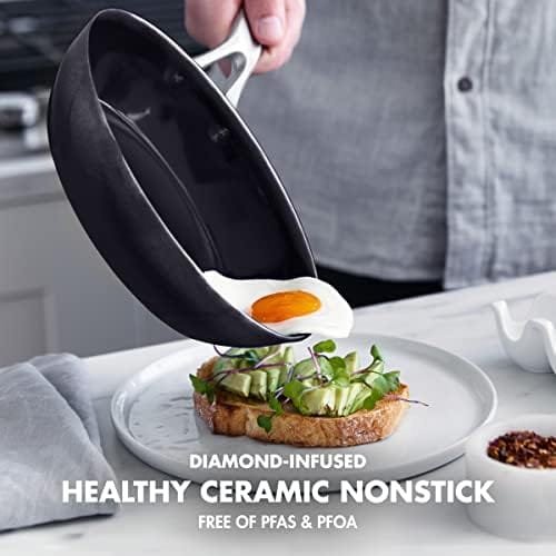 A synthesis of best-in-class design and cutting-edge technology, Omega is what happens when the inventors of ceramic nonstick create cookware for daily use. Built for remarkable performance, this 9.5” frying pan is the perfect size for quick bites and full meals alike. No matter what you’re making, you can use less oil and get more contact with this pan’s innovative Balance Pro Base. All pans flex when they’re heated, but this pan is designed to flex internally, meaning oil stays where you put it and your food gets maximum contact with the pan. This 9.5″ frying pan features our signature healthy ceramic nonstick coating, which is ultra-durable, scratch-resistant, and features layers of diamonds for extraordinary performance. As always, it’s PFAS-free to make every meal healthier. These pans also feature Magneto Induction Technology for remarkable performance on all stovetops, including induction. The sturdy stainless steel handles are specially angled to stack easier to save space in the cabinet. Oven and broiler safe to 600˚F. Dishwasher safe for easy cleanup.