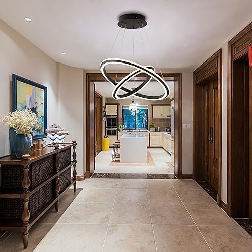 【Durable & Adjustable Led Ring Chandelier】The modern black chandelier is 31.5 inches in diameter and height adjustable from 1 inch to 78.74 inches. This flexibility allows you to customize the shape and height of your chandelier to match your ceiling and the aesthetics of your room.The chandelier uses high-brightness LED chips with a lifespan of more than 45,000 hours. The extended service life helps reduce electricity costs over time;