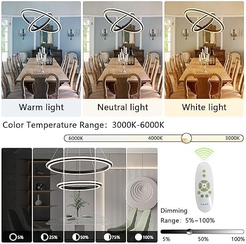 【Dimmable Color and Brightness LED Chandelier】An incredible ring chandelier will be the focal point of any room by serving as a decorative style element that enhances the beauty of fine furnishings. Integrated led source can provide extremely brightness to each corner of your room up,up to 8500 lumious.Brightness and color temperature can be freely adjusted by the remote control which comes with this modern chandelier.The color temperature dimmable range is 3000K-6500K,bringtness rang 10%-100%;