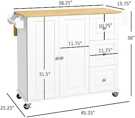 Rolling Kitchen Island Info: Overall Dimensions: 45.25″ W x 25.25″ D x 36″ H. Weight Capacity: 99 lbs. (Total), 33 lbs. (Drop Leaf/Cabinet), 11 lbs. (Drawer), 7 lbs. (Spice Rack). Assembly required.