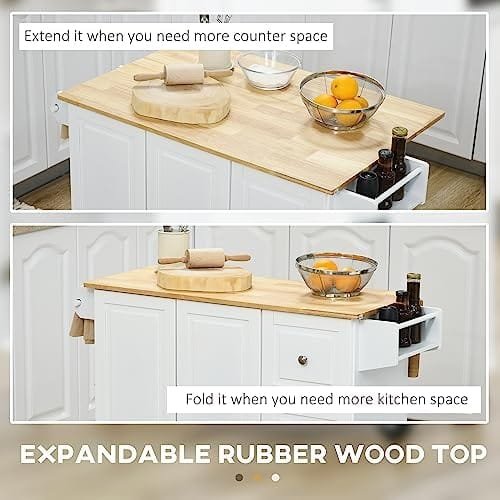 Drop Leaf Countertop: Our kitchen island on wheels can be small and compact for storage. Its solid rubber wood countertop can be expanded when you need more counter space and folded when you need more kitchen space.
