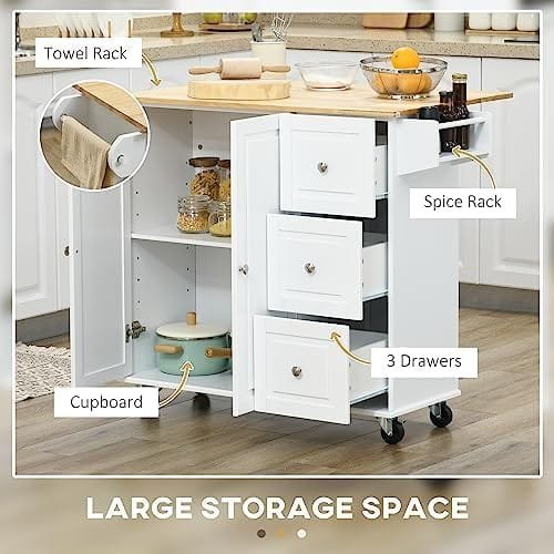 Get Organized with Added Features: A spice rack and a convenient towel rack on both sides of our small kitchen island offer greater organization and an easy way to push the cart.