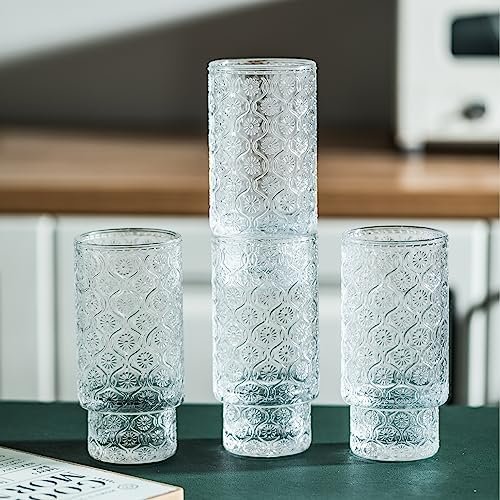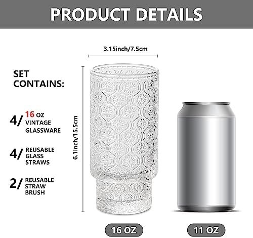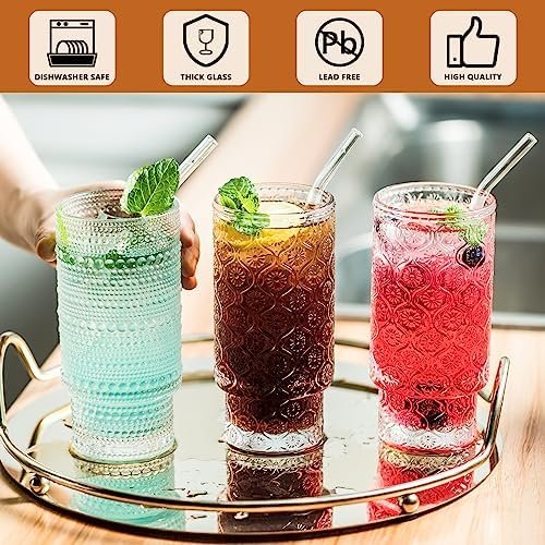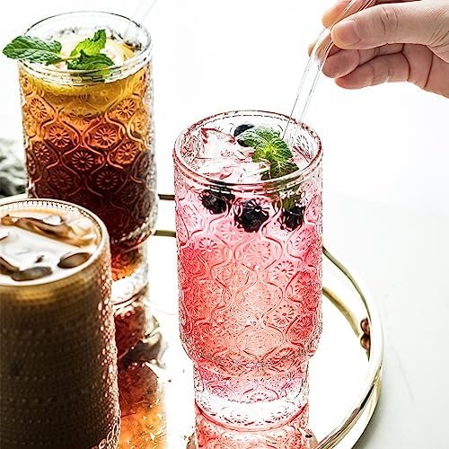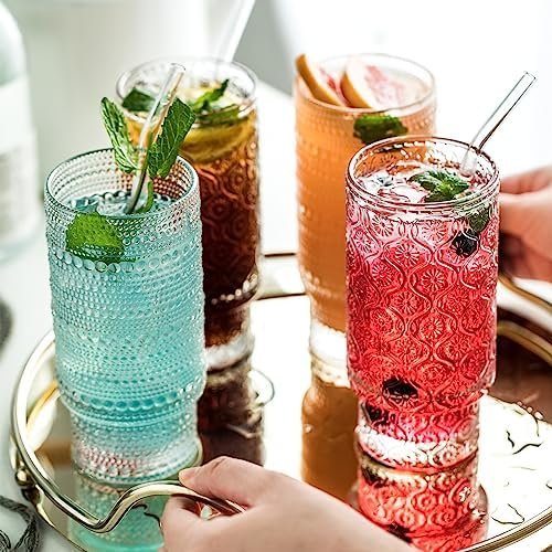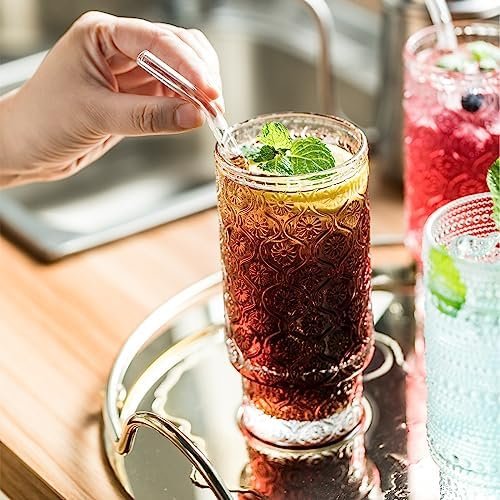 INSETLAN Vintage Embossed Glassware Set – 16oz Stackable Cups for Beer & Cocktails – Perfect for Bar Beverages, Iced Coffee, Juice, Water – Includes Glass Straws – Elegant & Durable Glassware