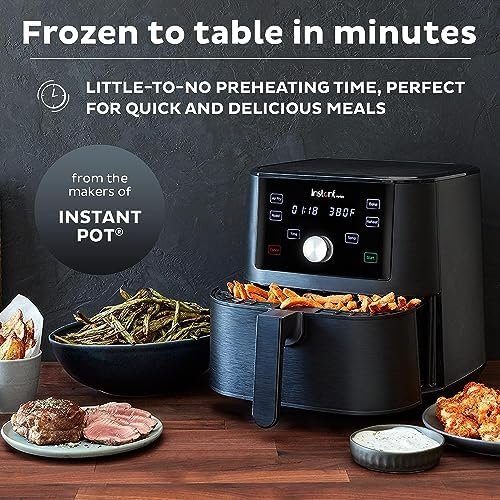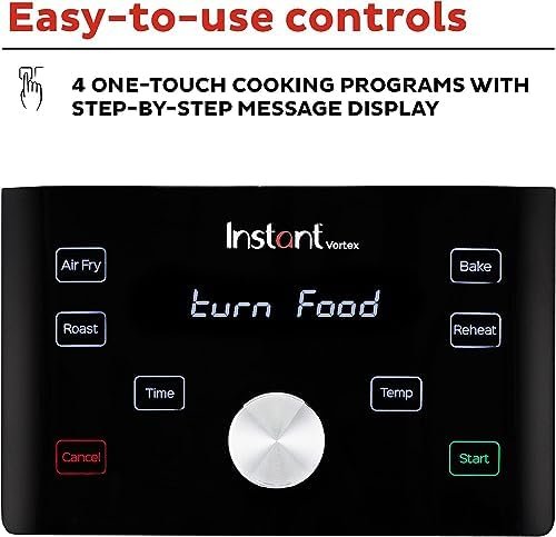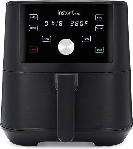 The Instant Vortex 6 Quart Air Fryer is easy to use, easy to clean, fast, versatile and convenient. Now you can make all your fried favorites without the oil, mess and hassle of deep frying. Enjoy delicious flavor with the touch of a button. Use the preset Smart Programs to air fry, roast, bake and reheat all your family favorites. Air fry juicy chicken wings, crispy fries and onion rings from fresh or frozen. Roast cauliflower bites, shrimp skewers, garlicky potatoes and chicken nuggets. Bake calzones or mini pizzas, fluffy cinnamon rolls, yummy cookies and chewy brownie bites. Or, reheat last night’s dinner for lunch. Customize the time and temperature for total control over your cooking, and save your presets so your favorite meals can be made with the touch of a button. As heat is circulated by a powerful fan, your food cooks and gets that amazing deep-fried taste and texture using 95% less oil and grease than deep frying. Less grease means less mess. Say goodbye to your microwave, pizza oven and convection oven — anything they can do, the Instant Vortex Air Fryer can do better.