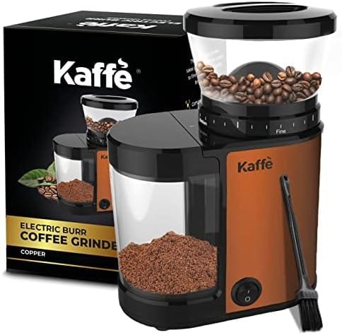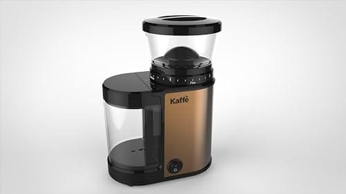 The Kaffe KF8023 burr coffee grinder offers professional-quality, consistent grinds of uniform coarseness or fineness at the touch of a button. The burr mechanism grinds using two revolving abrasive surfaces, giving you more precision and control than a blade grinder. Quickly and efficiently grind coffee beans for the French press coffee maker, coffee dripper, pour-over coffee, or espresso. Grinding coffee beans immediately before use releases the fragrant essential oils at the right moment to ensure maximum freshness, rich aroma for a full-bodied flavor, and complex, satisfying coffee with the most delicious taste – all in the comfort of your own home. Capacity of up to 5.5 oz with a grinds reservoir of up to 20 cups lets you grind to suit your party size. With its powerful motor and stainless steel burrs, this electric grinder will serve you for years to come. With the transparent chamber, you get to monitor the grinding process. The appliance is easy to clean: Simply use a cleaning brush or wipe parts with a damp, soapy sponge. The dishwasher-safe lid can be washed on the top shelf of your dishwasher. Safety feature: This grinder is designed to operate only once the hopper and grind chamber are securely in place. The attractive brushed copper stainless steel finish adds elegance to any kitchen. The perfect gift for a coffee lover, and a wonderful kitchen buddy for those who love convenience at their fingertips.