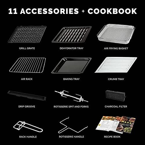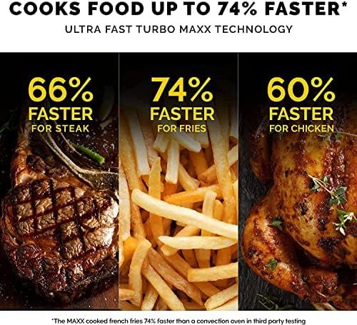 10-in-1 VERSATILITY — As Seen on TV multifunctional air fryer toaster oven & grill can air fry, grill, bake, toast, roast, braise, sear, rotisserie, dehydrate, and broil with the same machine; COOKS FOOD FASTER — Turbo MAXX Technology and supercharged hot airflow cook food 74% faster with exceptional caramelization