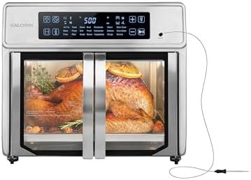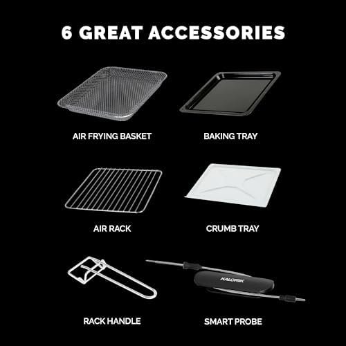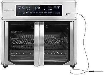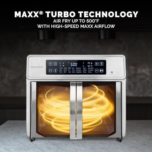 Find your inner chef. Enjoy optimum convection baking and air frying with Kalorik MAXX Advance 26 Quart Digital Air Fryer Oven. The dual-speed fan offers Turbo MAXX technology for faster cooking times, and crispy, evenly cooked results when air frying. Cook food faster with MAXX Turbo technology and a dual-speed fan. The slow speed mode achieves optimal convection baking with a gradual cooking environment that keeps in and circulates moisture. Maxx Advance reaches 500°F for a searing that gives you the marvelous caramelization you love. Easy touch controls and intuitive navigation cut out the guesswork on your favorite recipes. 21 Smart presets deliver delicious results on French fries, juicy roasted chicken, crisp-crust pizza, and more. A precision smart food probe ensures you’ll never undercook or overcook a meal again by shutting off the oven once the desired internal temperature is reached. Conveniently switch between Fahrenheit and Celsius, as the MAXX Advance lets you choose your preferred measurement system. With the Mute option, the control panel sounds can be switched off for quiet mode operation. Modern French doors open with a single pull, with stainless steel handles on trend with kitchen décor. Do more with these six premium accessories included with your Maxx Advance: an XXL air frying basket, smart food probe, enamel-coating baking tray, crumb tray, multifunctional air rack, and accessory handle for safe and secure handling.