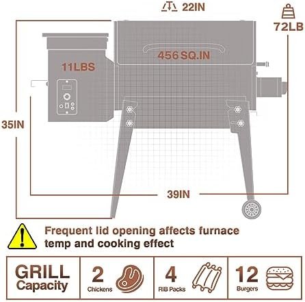 Versatile 8-in-1: Outdoor BBQ, baking, roasting, braising, smoking, grilling, searing, and char-grilling. Grill capacity of 456 sq inches, and capacity for 12 burgers, 4 racks of ribs or 2 whole chickens.