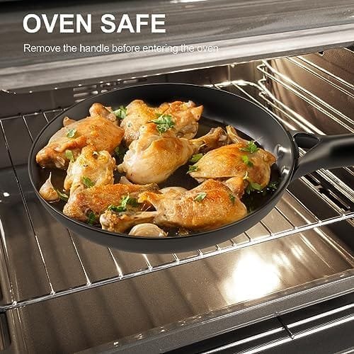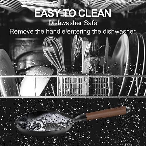 NO RUST & EASY TO CLEAN: The skillet adopts cutting-edge anti-rust treatment technology to ensure that it will not rust for a long time. It maintains its rust-resistant properties no matter how long you use it. At the same time, this frying pan is easy to clean, food residue will not adhere to the surface, and it can be restored to its original shape with an easy wipe.Also dishwasher safe。(tips:Remove the handle before going into the dishwasher)