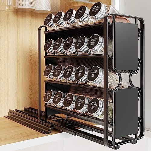 LIVOD Spice Rack Organizer for Cabinet, Pull Out Spice Rack with 20 Jars, Spice Organizer for Cabinet with Labels and Chalk Maker, 4 Tier Sliding Cabinet Spice Organizer, 4.5″ W × 10.6″ D × 11.6″ H