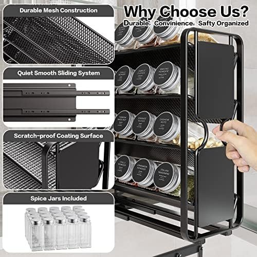 【SMOOTH OPERATION】: Ball Bearing Glides Ensure Smooth Operation. Our spice rack organizer for cabinet features full extension ball bearing glides that provide easy access to all your favorite spices and seasonings. With our cabinet spice rack’s unique design, you can easily slide spices in and out with minimal effort, making cooking a breeze.