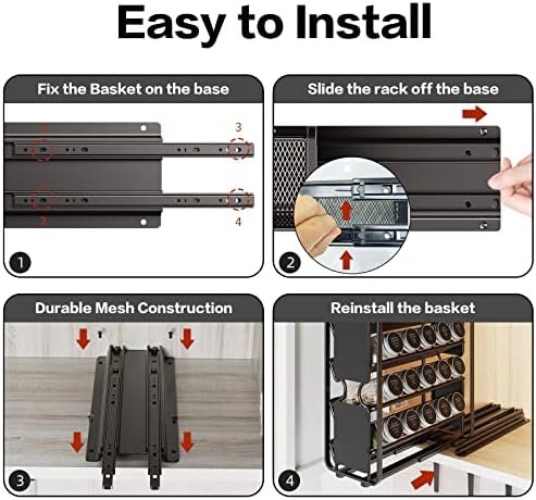 【PERFECT FOR NARROW CABINETS】: Made of premium quality steel construction, this sliding spice organizer is built to last. Inclined design make the space saving spice racks easy to locate and quickly grab what you need, turn any mess of spice into an organized masterpiece. It is easy to install by removing the sliding base bottom.