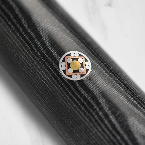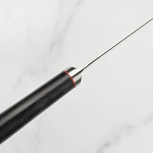 Durable Micarta D-shape handle with bolster and metal end cap for the perfect comfort and balance; decorative mosaic pin, red spacers and Miyabi logo engraved on handle end