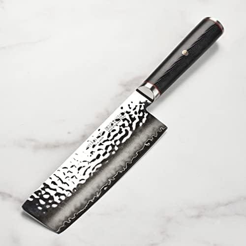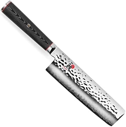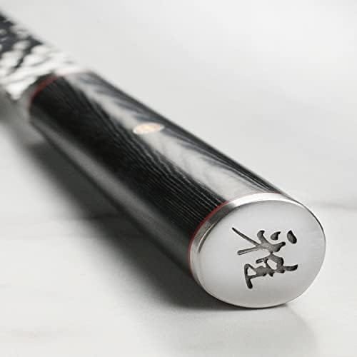 Miyabi celebrates Japanese craftsmanship with Mizu. Using traditional methods and innovative techniques, these knives merge the past and present into one exceptional knife collection. The SG2 micro-carbide powder stainless steel core is wrapped in another layer of stainless steel with a hammered (“Tsuchime”) Damascus finish. The Cryodur heat treatment process results in a blade with a high Rockwell Hardness rating of 63, providing superior edge retention, corrosion resistance and blade flexibility. Miyabi artisans then perform the Honbazuke sharpening method that originated from traditional Japanese sword making. This 3-step process includes sharpening the blades twice on whetstones, followed by mirror polishing on a leather wheel. Used over 1000 years ago for samurai swords, this is what gives these knives their signature Miyabi razor sharpness. The meticulously crafted blade is then accompanied by a stunning, comfortable and durable D-shaped Micarta handle and stainless steel bolster. Beautiful accents adorn the handle including a decorative mosaic pin, red spacers, the Miyabi logo engraved on the handle end. Handcrafted in Seki, Japan.