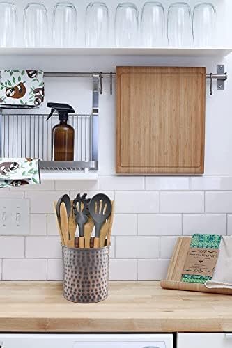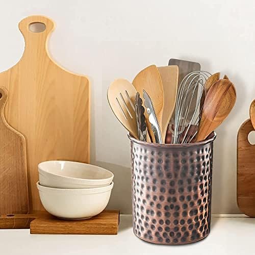 Quality constructed: Immerse your kitchen in luxury with our utensil holder, meticulously crafted by skilled artisans. Heavy gauge metal construction, coated with zinc, guarantees lasting durability. This meticulous craftsmanship results in a hand hammered, exquisite textured finish that exudes sophistication. Elevate your kitchen’s interior with this high-quality masterpiece, marrying exceptional design with functionality.
