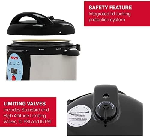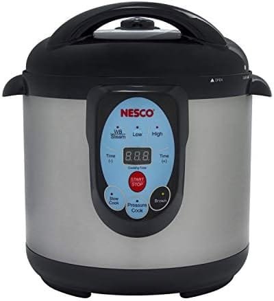 The NESCO NPC-9 Smart Canner & cooker creates a perfect balance between safety, performance, and versatility and will soon become one of your favorite kitchen appliances. Designed to eliminate the common mistakes that cause harm or spoil food during the canning process. The smart Canner & cooker gives users uncompromised safety and peace of mind. Multiple built-in safety features control and regulate the pressure continuously and allow you to can and cook without worry. The multi-functional digital display and pre-set programs give you the right tools to ensure consistent results when canning fruits, jams, pickles, salsas and more. The safety lock lid with automatic float valve ensures that the lid fits correctly and identifies when pressure is present. Water bath and pressure functions take the guesswork out of the equation and simplify the ability to can your harvest. The removable 9.5 qt. Non-stick cooking chamber is dishwasher safe and can hold and process four quart (wide-mouth), five pint or sixteen 4 oz. Jelly jars at a time. The durable stainless-steel body is light-weight and has side handles for safe handling. The NESCO Smart Canner & cooker also prepares your favorite slow-cooked recipes faster and makes healthy, delicious meals with a touch of a button. Easy to clean and perfect for quick and efficient pressure/slow cooking, browning, steaming vegetables and cooking rice. Additional accessories include a canning rack and steam rack for canning and cooking options and a removable condensation catcher for easier clean up. Can the safe way with the NESCO Smart Canner and Cooker.