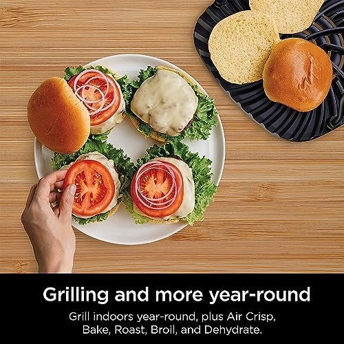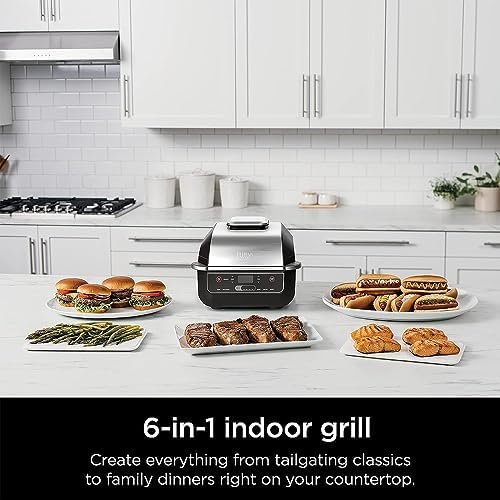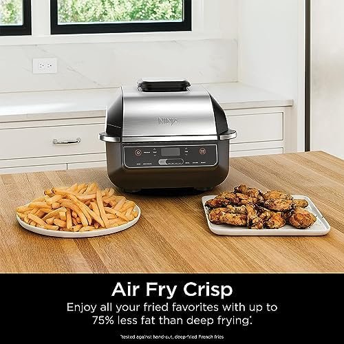IN THE BOX: Ninja Foodi 6-in-1 Indoor Grill and 4-Quart Air Fryer – 10″ x 10″ Grill Grate – 4-qt. Crisper Plate – 6-qt. Cooking Pot – Chef-Created 15-Recipe Book – Cleaning brush