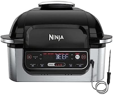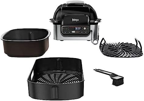 Meet the Ninja Foodi AG302 Indoor Grill. The grill that sears, sizzles, and air fry crisps. With unique Cyclonic Grilling Technology, 500°F rapid cyclonic air circulates around food for amazing Surround Searing while the 500°F high-density grill grate gives you delicious char-grilled marks and flavor without the smoke. It’s also an air fry crisper, allowing you to enjoy guilt-free fried food. Specifications 500°F air and 500°F grill grate for perfect char-grilled food The BTU cooking power of an outdoor grill for juicy flavors Transform foods from frozen to char-grilled in 25 minutes Nonstick, PTFE/PFOA-free, dishwasher-safe removable parts Virtually smoke free, with Smoke Control Technology Cooks food as fast as an outdoor grill Easy-to-use digital display Wide temperature range of 105°F–500°F and variable fan speed GrillControl temps: Low, Med, High & Max Veggie tray included to easily cook thinly sliced veggies 1760 watts 10″ x 10″ PTFE/PFOA-free, nonstick, ceramic-coated grill grate 4-qt. PTFE/PFOA-free, nonstick, ceramic-coated crisper basket 6-qt. PTFE/PFOA-free, nonstick, ceramic-coated cooking pot 5 stainless-steel kebab skewers