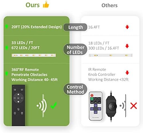 Total 672 LEDs / 20FT, which is much brighter than others, you could adjust the brightness with RF remote to fulfill different needs: daily / ambient / task lighting, decoration for festival, Christmas, for dinning room, living room, kitchen, cabinet, bedroom, stairs, TV, mirror, wine bar etc.