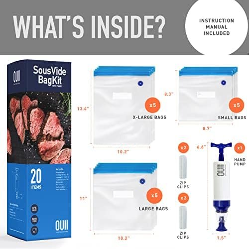 You Can Sous Vide Too! Make the switch to healthier, smarter cooking with the OUII starter kit! This sous vide bags kit is the simplest way to juicy, flavorful steaks, seafood and veggies right from your own kitchen. Whether you’re a newbie or a pro, the clear instruction manual guides you through every step. Why invest in bulky machines when you don’t have to!
