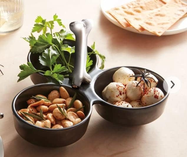 Modern skull server offers 3 bowls for different chips and dips Includes a bone-shaped handle for easy serving
