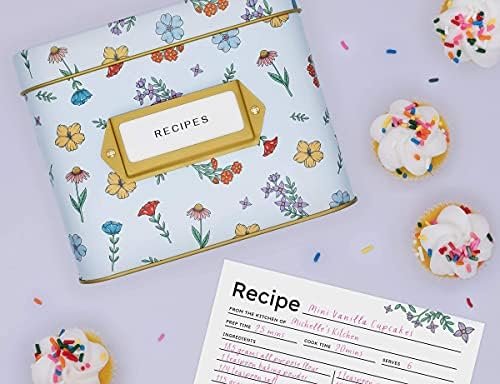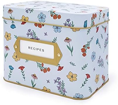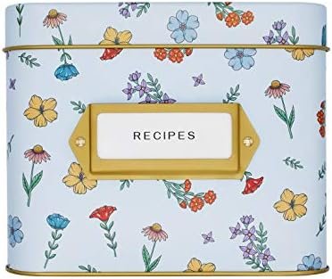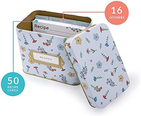 Poiet’s tin has wildflower patterns on the light sky-blue background color and gold-tone interior. Each box includes 50 recipe cards and 16 dividers. The removable front tag paper gives you more options to customize it.