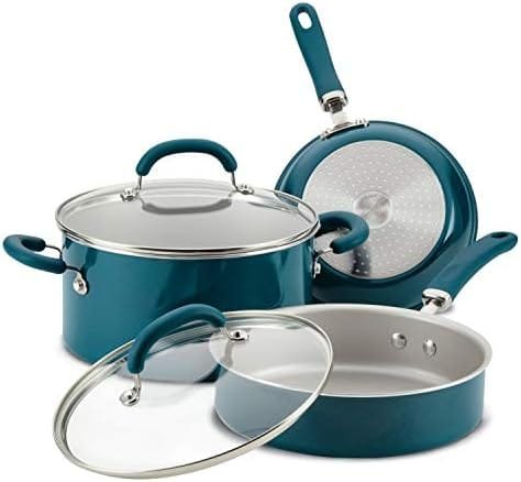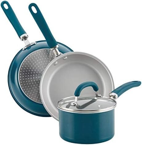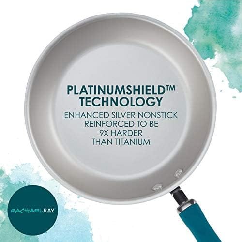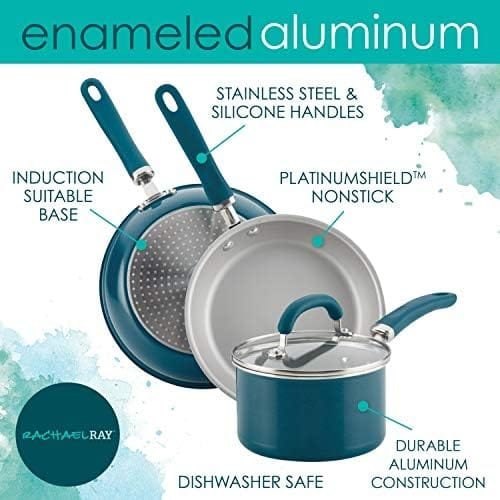 Radiant and solution-oriented, the Rachael Ray Create Delicious 13-Piece Aluminum Nonstick Cookware Set brings high performance and easy convenience to home chefs. Featuring vibrant, shimmering color combined with functionality, this collection of essential pots and pans by Rachael Ray is constructed of durable aluminum for even heat distribution to reduce hot spots. The cookware set features enhanced PlatinumShield Technology nonstick reinforced to be 9 times harder than titanium for effortless food release. Plus, all of the pots and pans are dishwasher safe for quick and easy cleanups. Colorful, dual-riveted stainless steel and silicone handles provide comfort and control that’s oven safe to 400°F. Flared cookware rims make for easy pouring, and an induction-compatible stainless steel base provides strength, durability, and versatility to use the pots and pans on any cooktop. Included in the 13-piece set, a 9-inch x 12-inch cookie sheet is ready for chicken wings and cookies alike, and the nylon turner utensil will have you ready to flip and serve from the get-go.From dishwasher-safe convenience to enhanced durability of PlatinumShield nonstick, reach for the Rachael Ray Create Delicious 13-Piece Aluminum Nonstick Cookware Set.