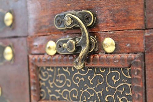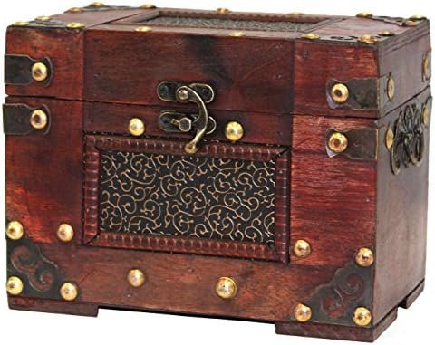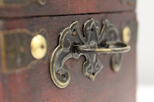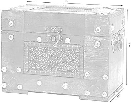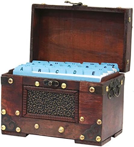 Studded detail around the box Stained wood adds a finishing rustic look Antiqued latch for secure protection Holds 4×6 sized recipe cards, not included.